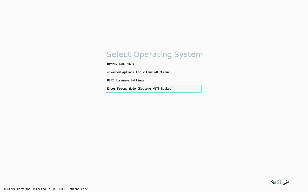 - Nitrux Rescue Mode: An automated, initramfs-based recovery mechanism designed to restore (rollback) the system to a known good state without external media.