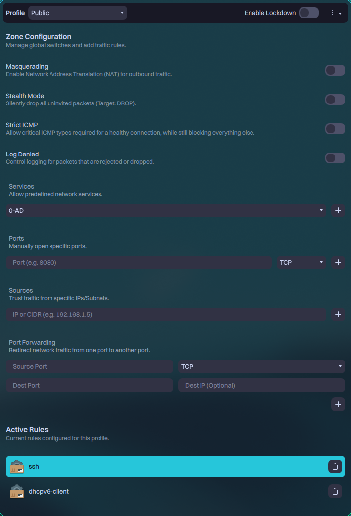 - Add or remove services, ports (TCP/UDP), and port forwarding rules